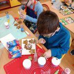 Warsztaty zdobienia pierniczków w klasie 2b były prawdziwie magicznym czasem. Sala wypełniała się zapachem korzennych przypraw, śmiechem i radosnym gwarem dzieci. Uczniowie z ogromnym zainteresowaniem i kreatywnością ozdabiali pierniczki, tworząc małe, słodkie dzieła sztuki.